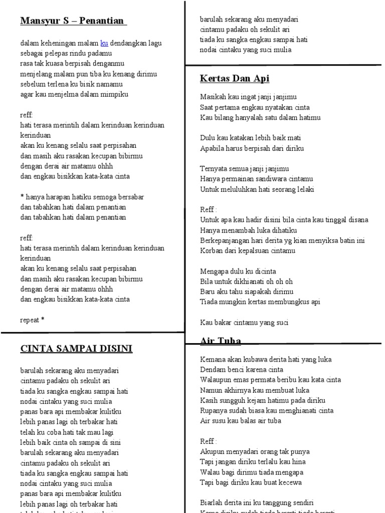 Lirik lagu mansyur s penantian. All MP3 songs are for personal non-commercial use only. Lirik Lagu Sejengkal Tanah - Mansyur S Hati terasa merintih dalam kerinduan kerinduan kerinduan. Lirik lagu Buta Karena Cinta Mansyur S lirik lagu Di Mata Air Tidak Ada Air Mata Iwan Fals lirik lagu Popanjilimo Kaili lirik lagu Hari Berbangkit Rhoma Irama lirik lagu Pejuang Cinta Hello Band lirik lagu Bara Cinta Rita Sugiarto lirik lagu Dilema D Massive lirik lagu Tondo Moto Langgam lirik lagu Pergi Ke Bulan Klarinet lirik lagu Nusantara Finalis Indonesia lirik lagu.