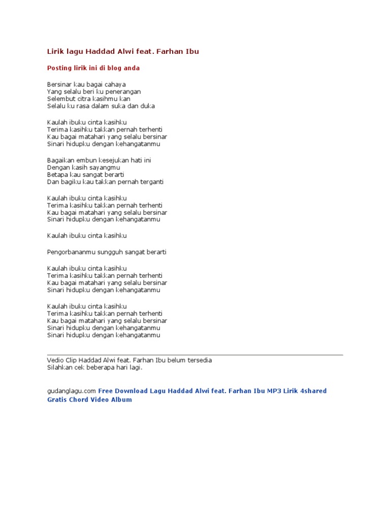 Video dan mp3 sekiranya ada diperolehi melalui carian di Youtube dan Google. Lirik Ibu Feat Farhan oleh Haddad Alwi. Lirik lagu ibu yang dinyanyikan oleh haddad alwi.