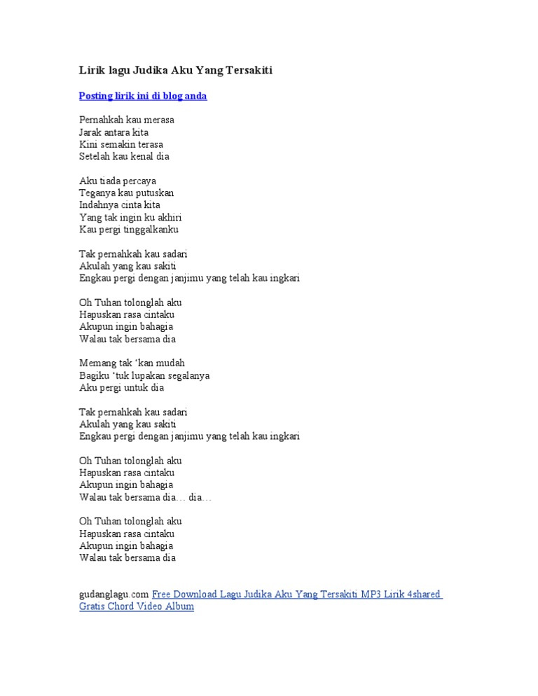 Download MP3 - - - Watch Video. Lirik lagu Judika Aku Yang Tersakiti. Download Lagu Aku Yang Tersakiti Judika MP3 Gratis hanya untuk Review saja jika kamu suka dengan lagu ini belilah CD Original atau Musik aslinya.