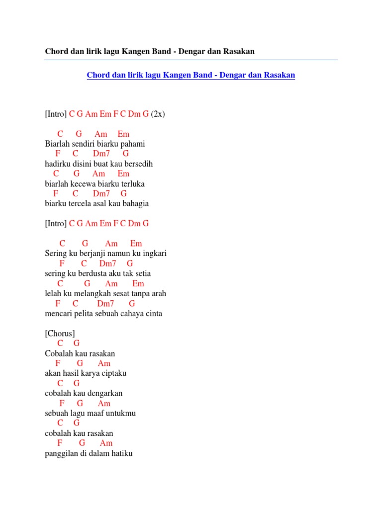 Lyrics Dengar Dan Rasakan on this site are provided for promotion and education only. Minggu 31 Januari 2021 Chord Gitar Pujaan Hati - Kangen Band. C G Cobalah kau rasakan F G Am akan hasil karya ciptaku C G cobalah kau dengarkan F G Am sebuah lagu maaf untukmu C G F G.
